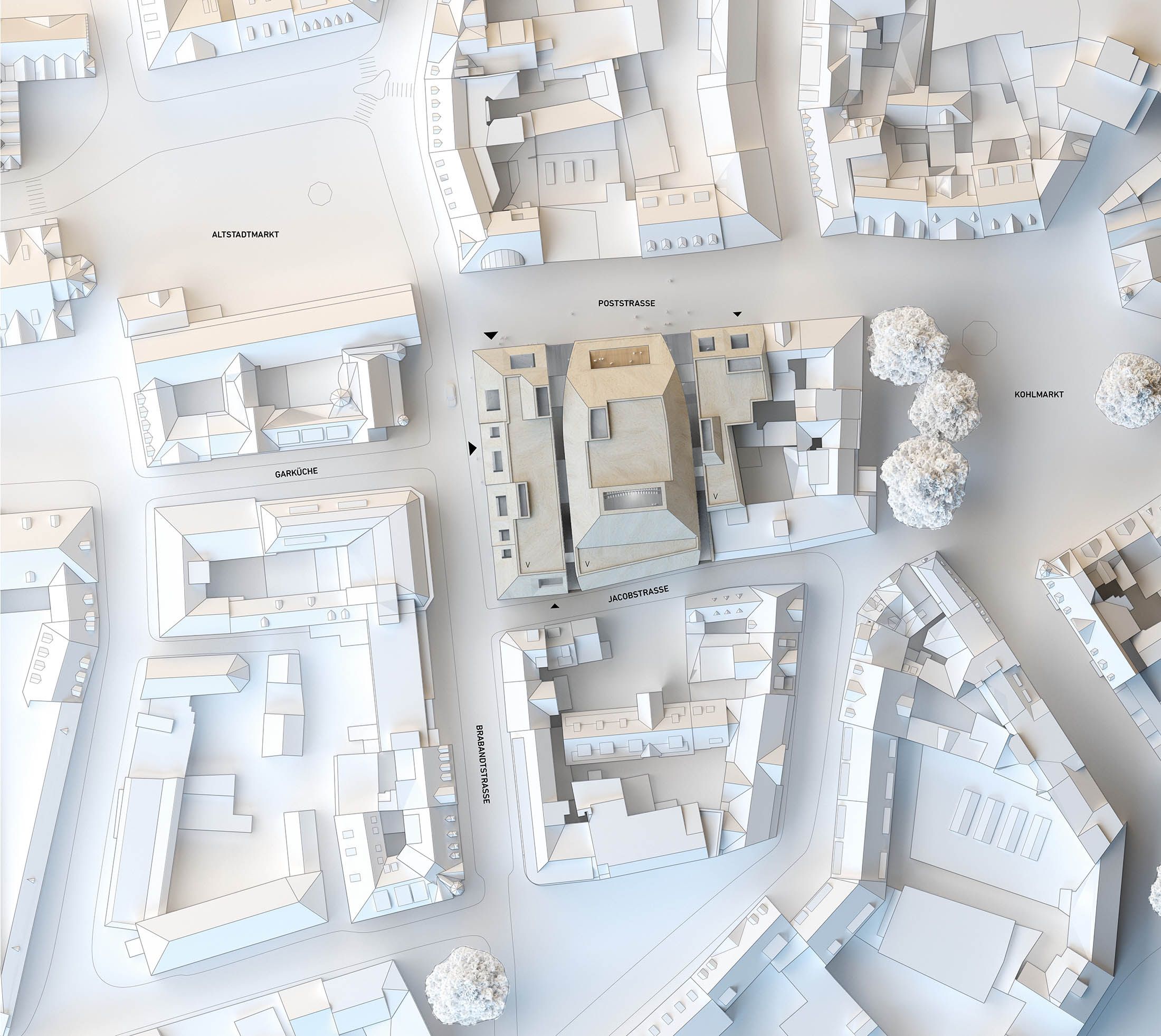 The volumes of the main concert hall, its ancillary functions, and the music school are clearly separated and given individual addresses. The concert hall is oriented toward Poststraße but also maintains a strong presence at the corner of Altstadtmarkt, where its main entrance is located, ensuring high public visibility from both directions.